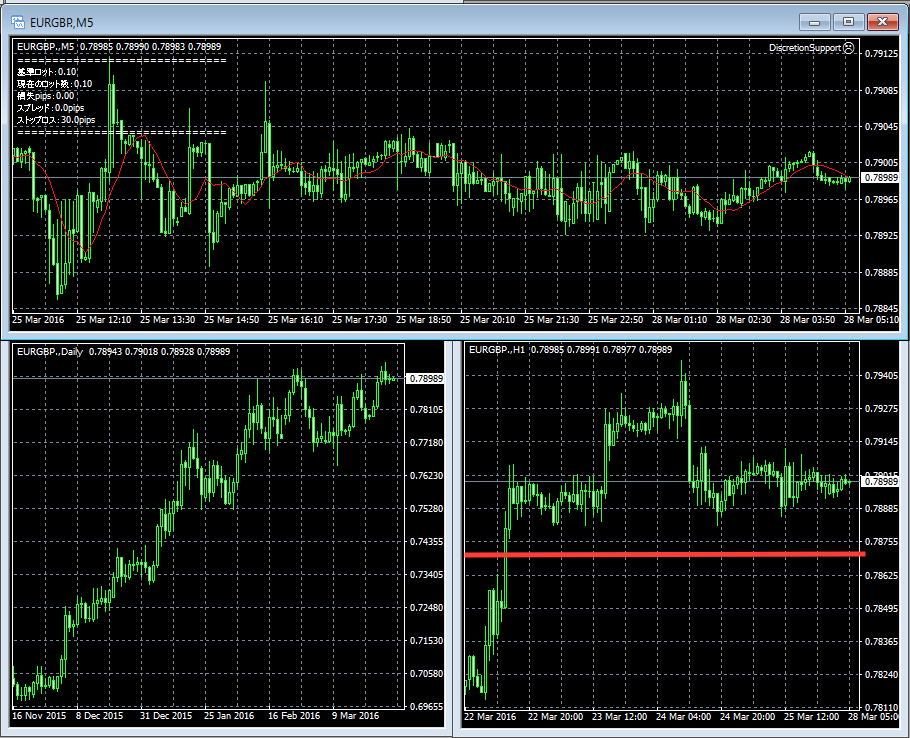 手法と言っても大変単純な手法で、日足で方向感を見て、1時間足と5分足でトレンド判定と勢い判定を行い5分足確定時にのみエントリーを行うだけです。