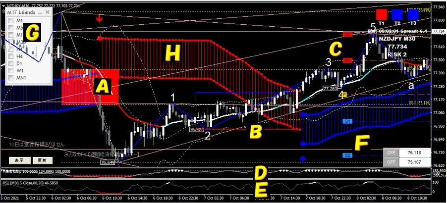 A 逆張りゾーン→反転上昇は青表示、反転下降は赤領域指示