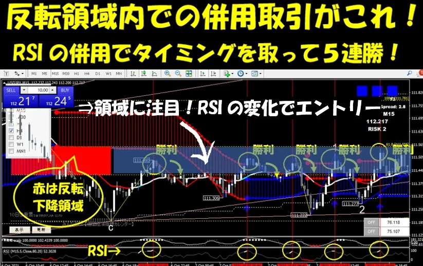 反転領域内にて別ロジックであるRSIの色変化によるタイミングで併用エントリーしたわけですが、御覧の通り「グンと精度が向上」しております。