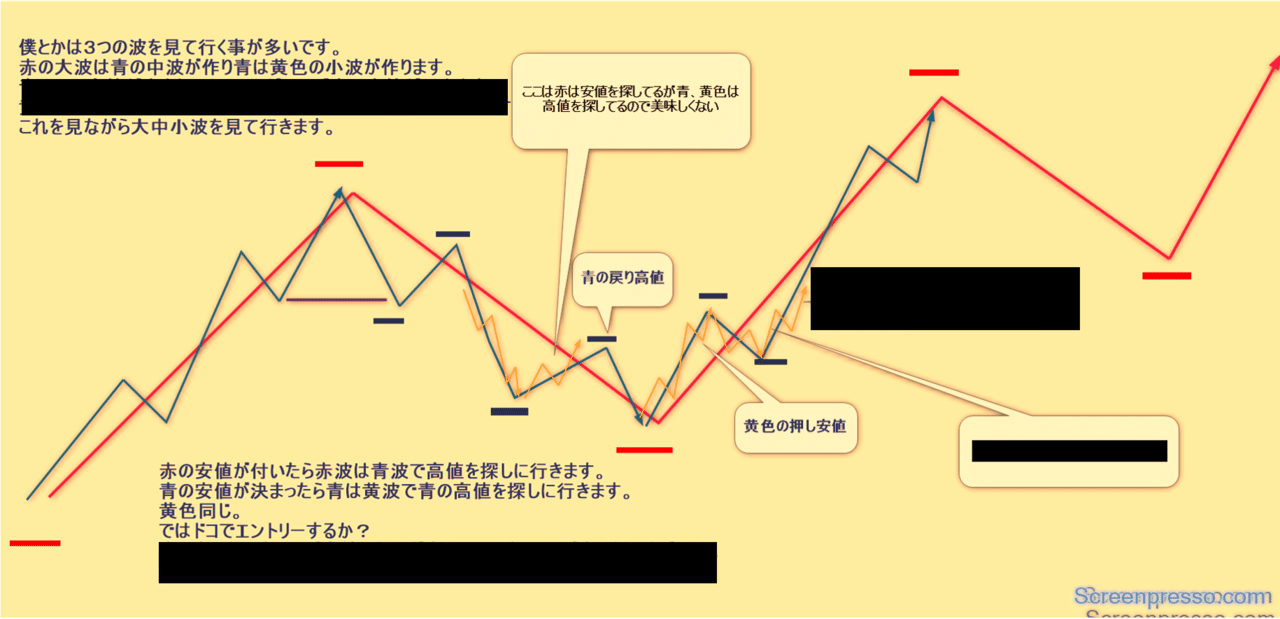 良く、赤が4時間足の波(トレンド)、青が1時間足の波、黄が15分足のイメージですか?と言われますが違います!
