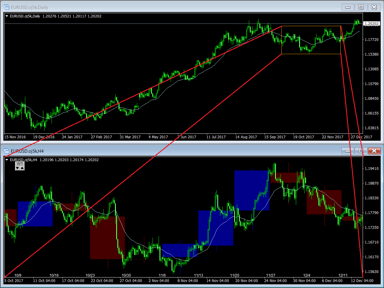 上記の画像は日足のチャートにこのインジケータを設置して、4時間足のチャートが表示している領域をオレンジ枠で囲う設定にした例です。