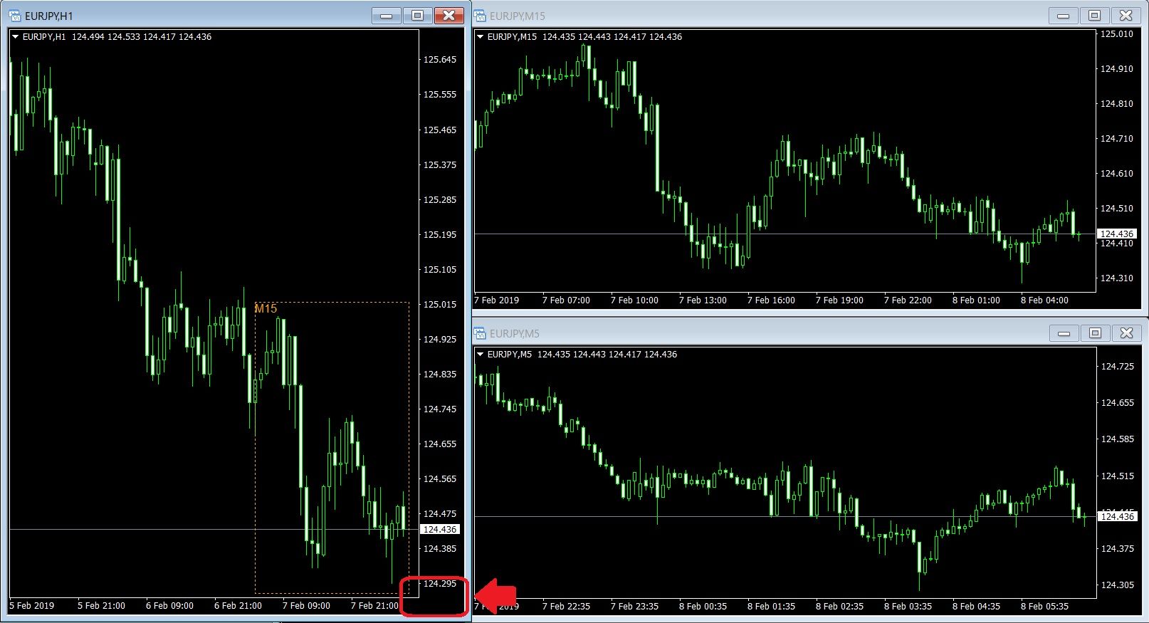 画面右下の赤枠辺りをクリックすると現在表示している枠より一つ小さい時間軸のチャートの枠表示に切り替えます。