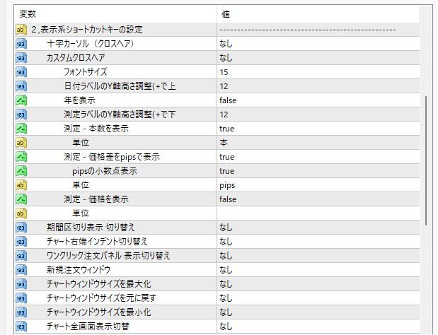 ・移動系(時間足の上下、スケール(バー)拡大縮小、次/前のチャート、スクロールなど