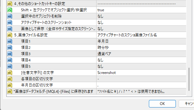 ファイル名を 年月日(.区切り)、時分秒、通貨ペア、各項-区切り に設定した際のファイル名