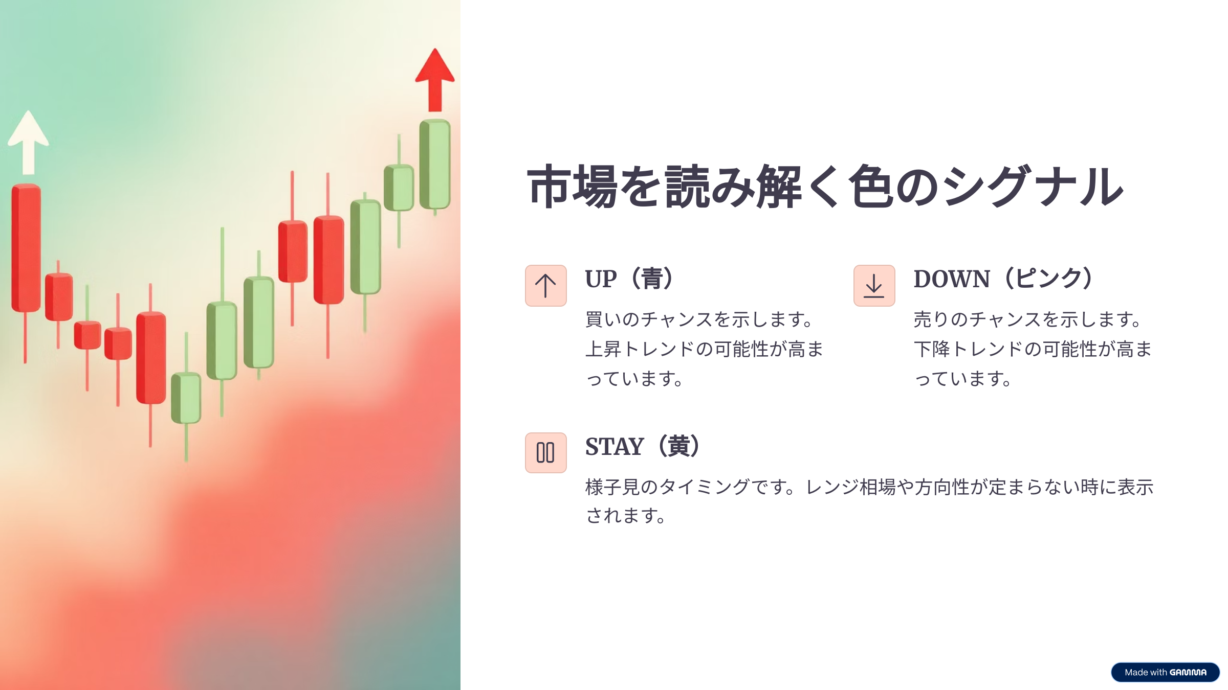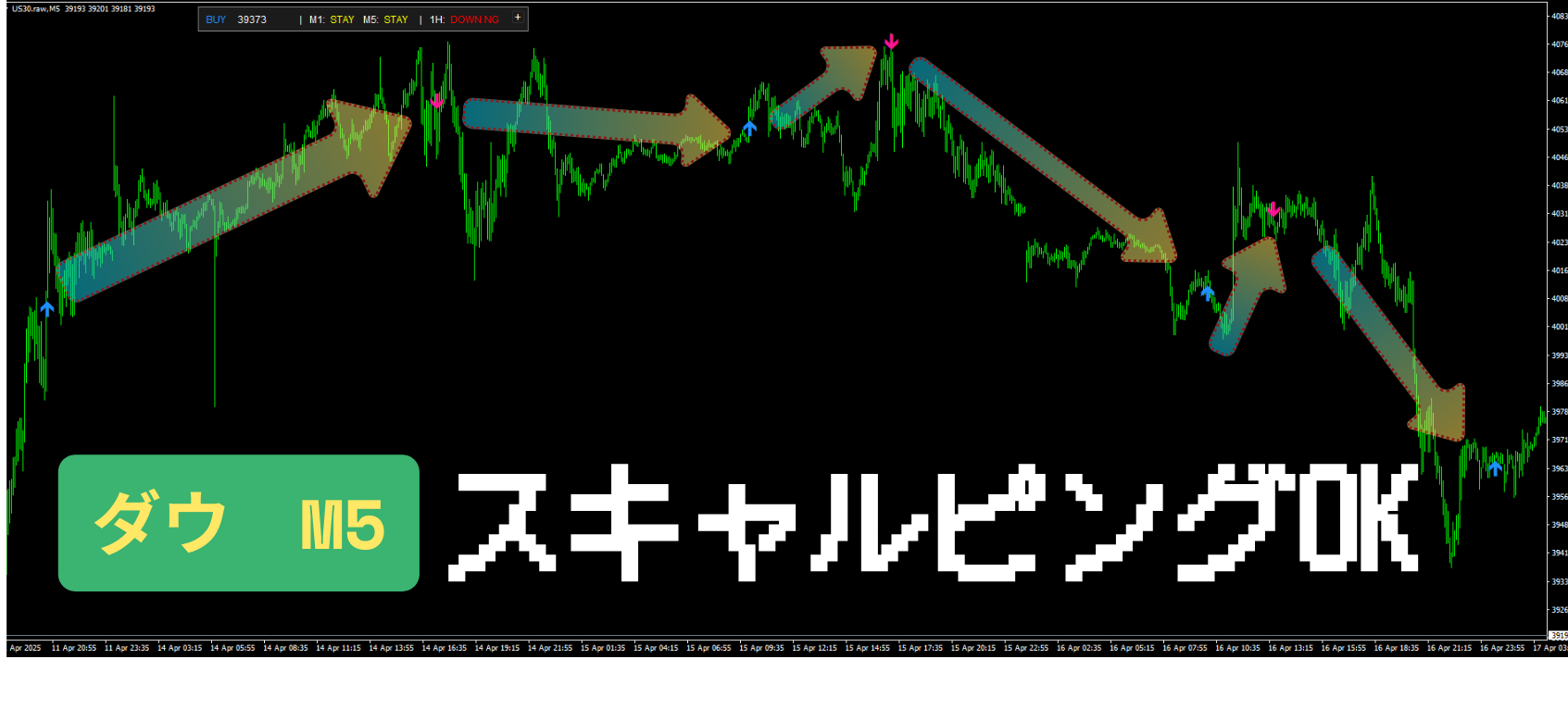 ピンク(DOWN):売りチャンス。下降トレンドを狙う。