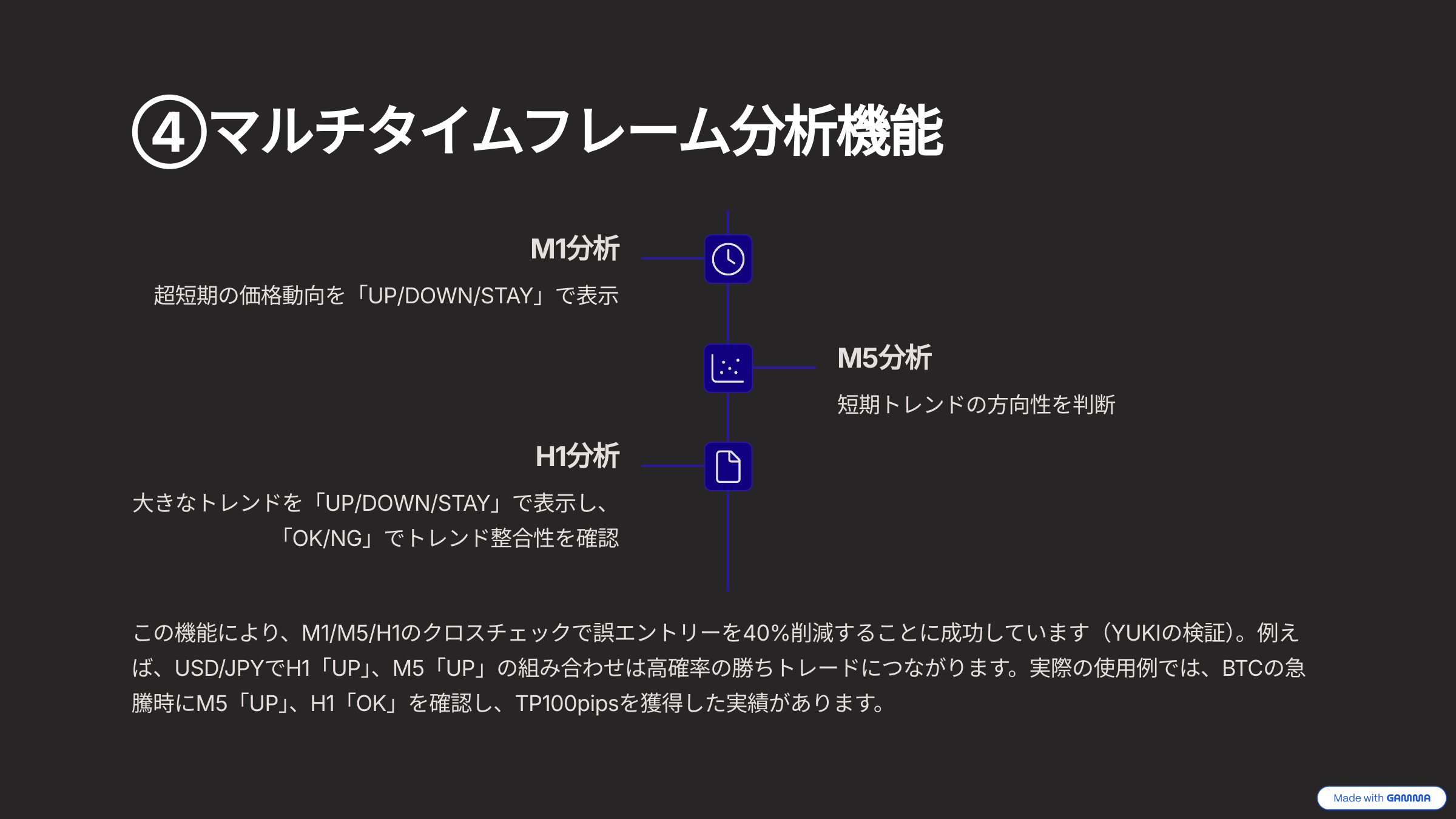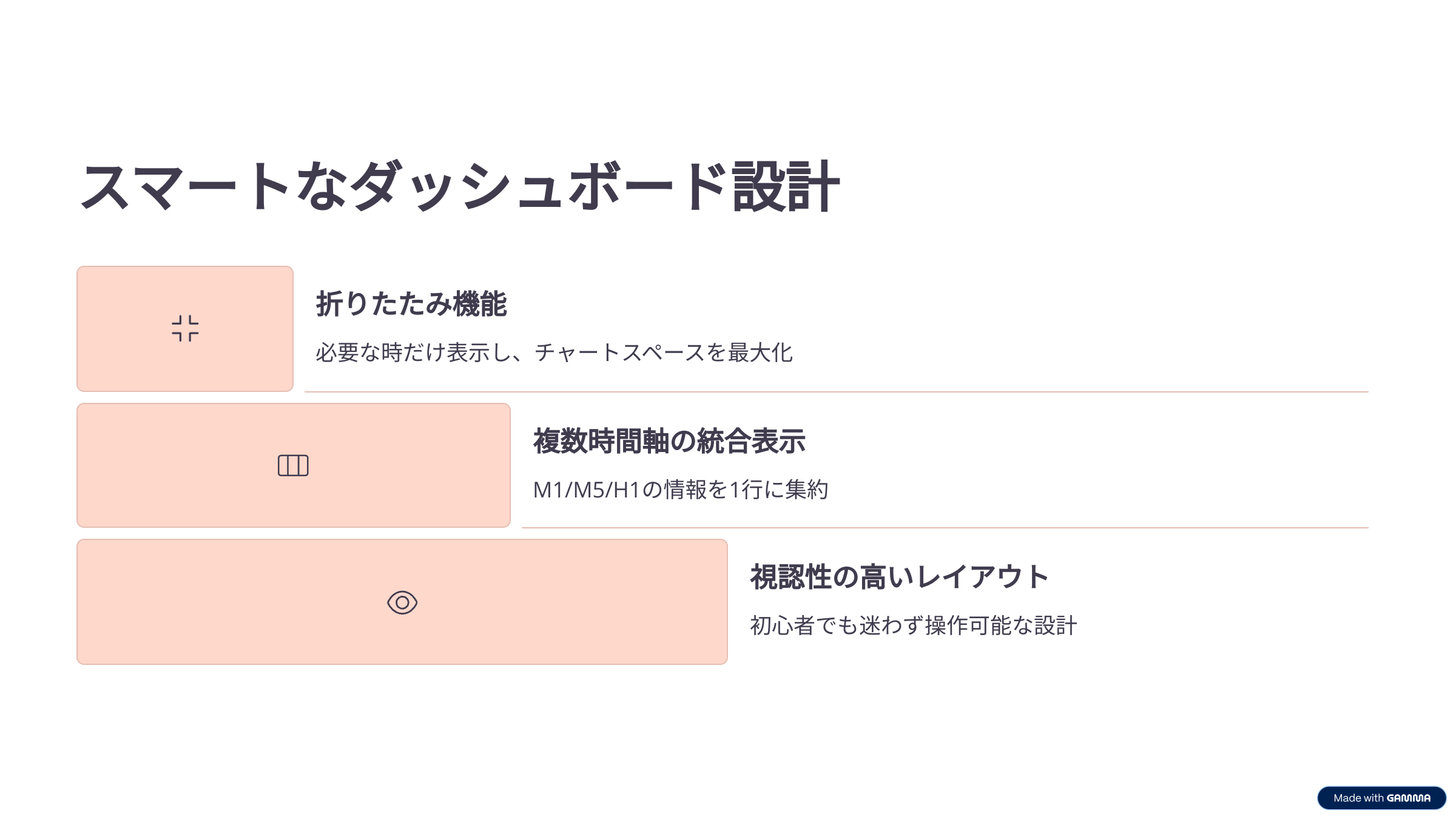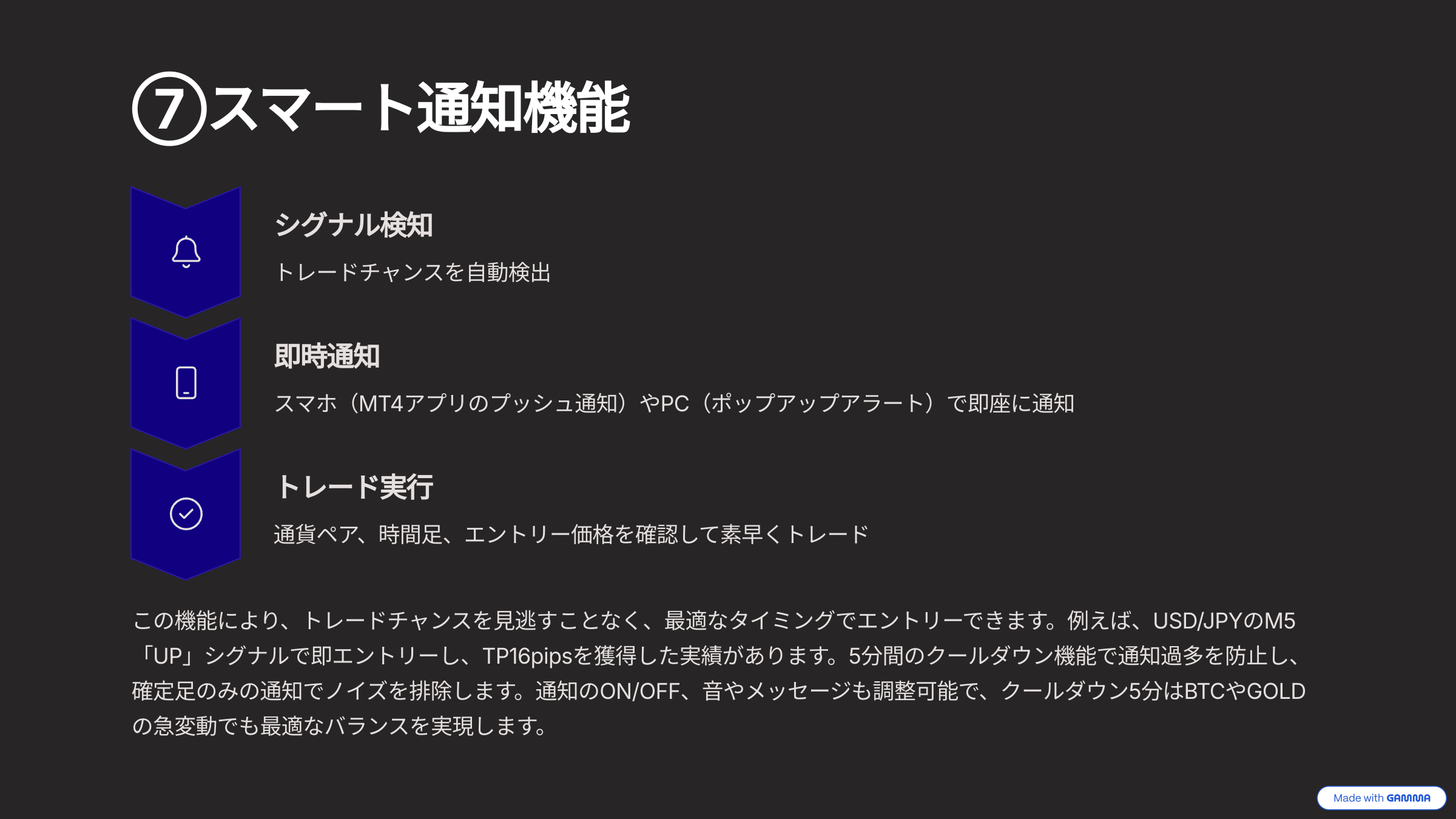 ダッシュボードでエントリー価格やTP/SLを一目で確認。複雑な計算は不要です。