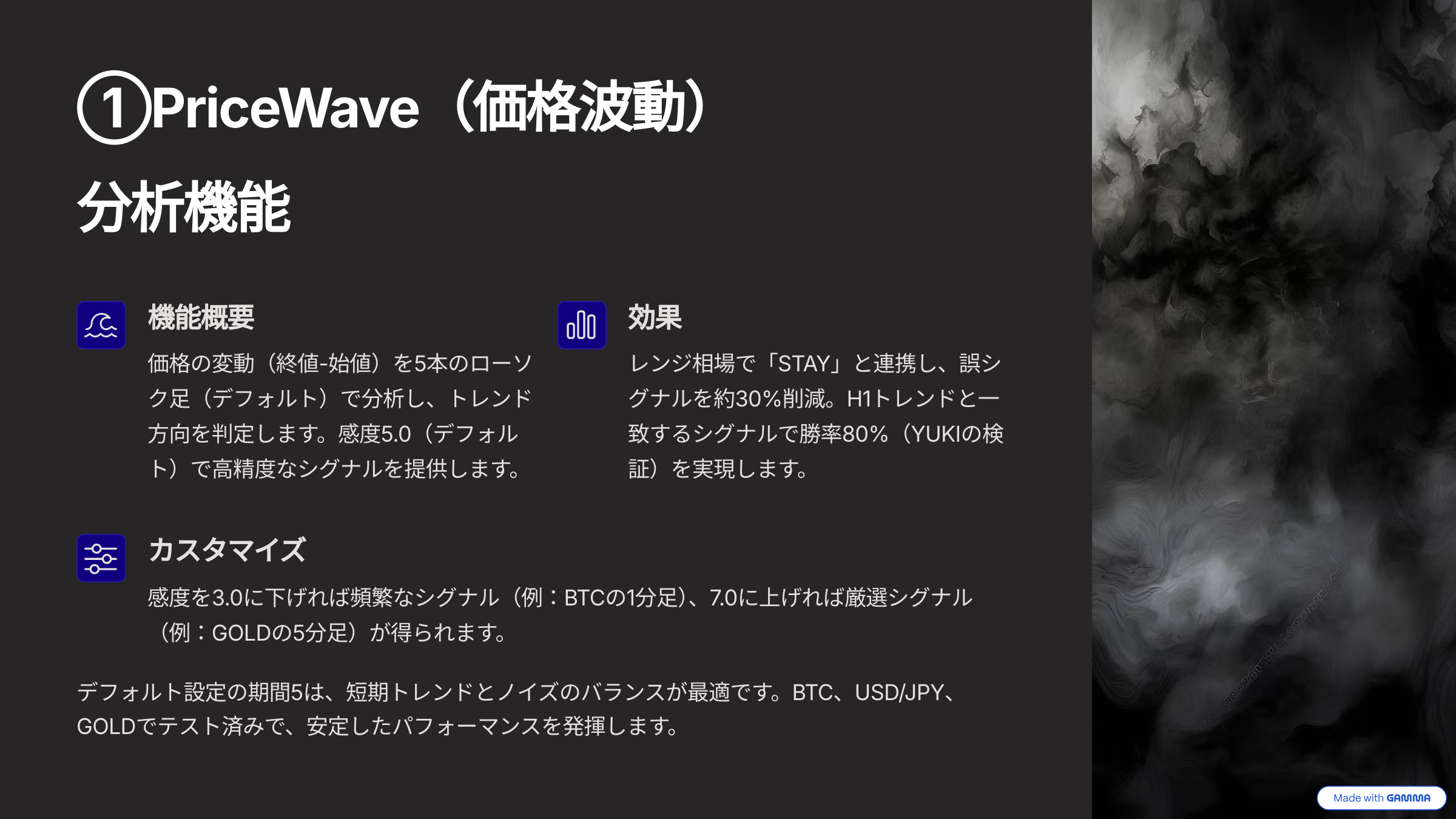 波(PriceWave):価格の上下の動き。例:1000円→1100円→1050円。この波から次の動きを予測。