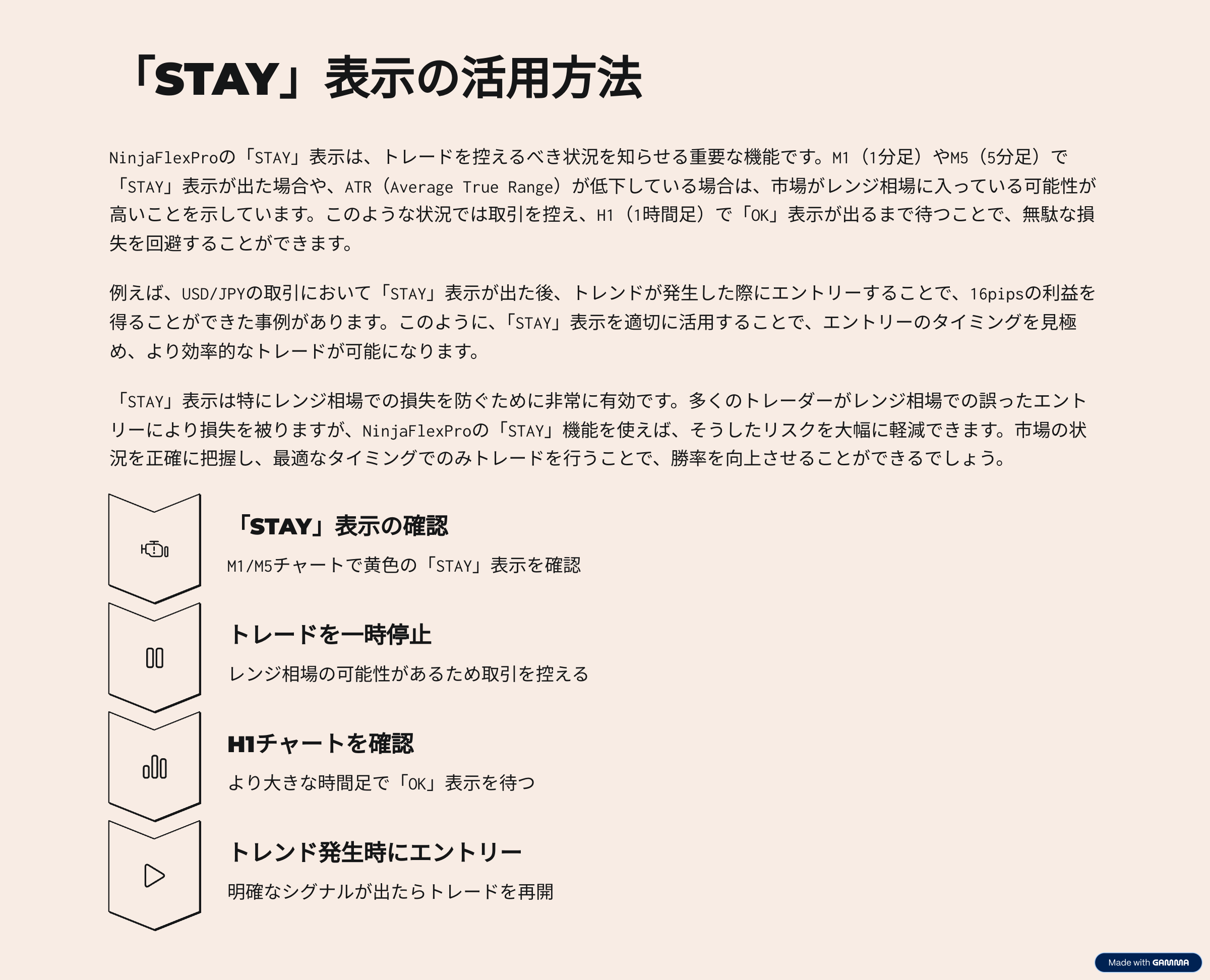 ATR(Average True Range):値動きの平均的な幅。例:ATR=10pipsなら、価格は通常10pips上下。NinjaFlexProはATRを活用し、利確・損切りを自動提案。