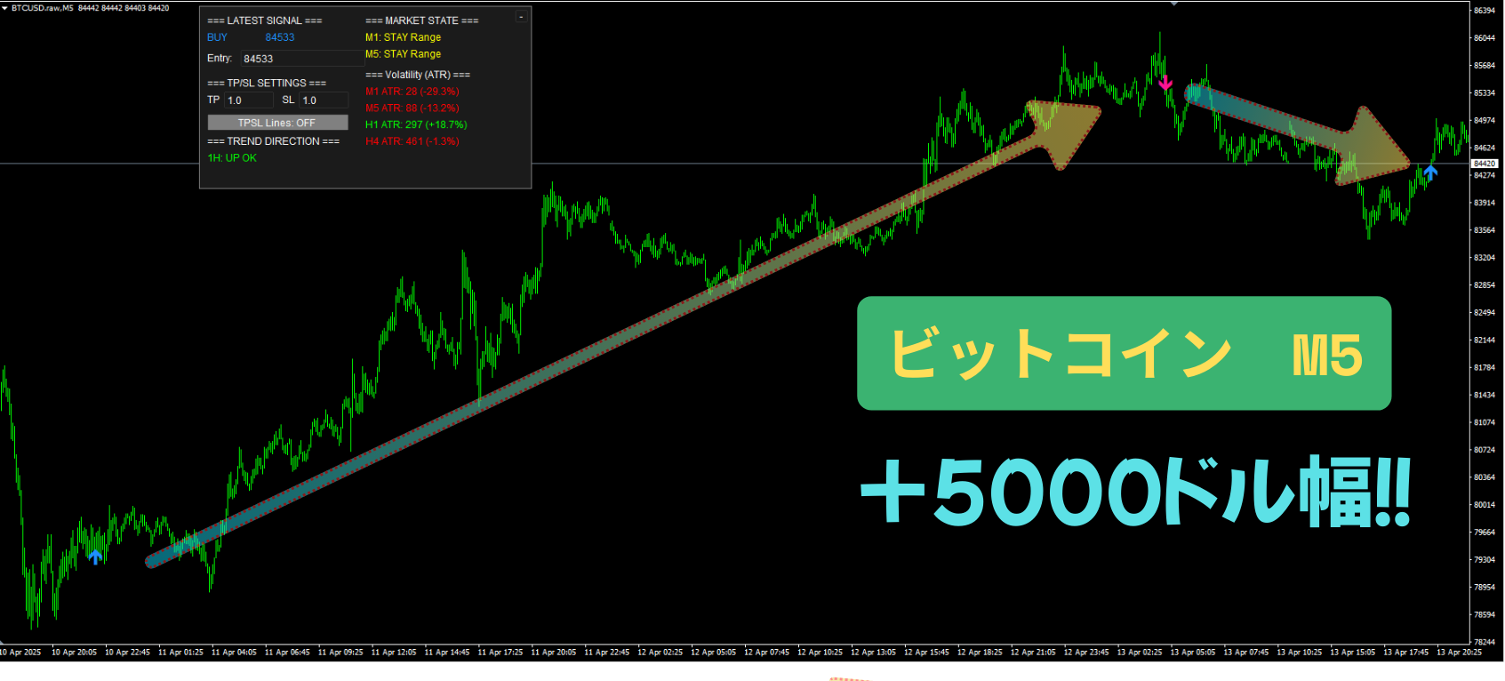 ボラティリティに自動対応。例:仮想通貨(ATR=50pips)ならTP100pips、USD/JPY(ATR=8pips)ならTP16pips。
